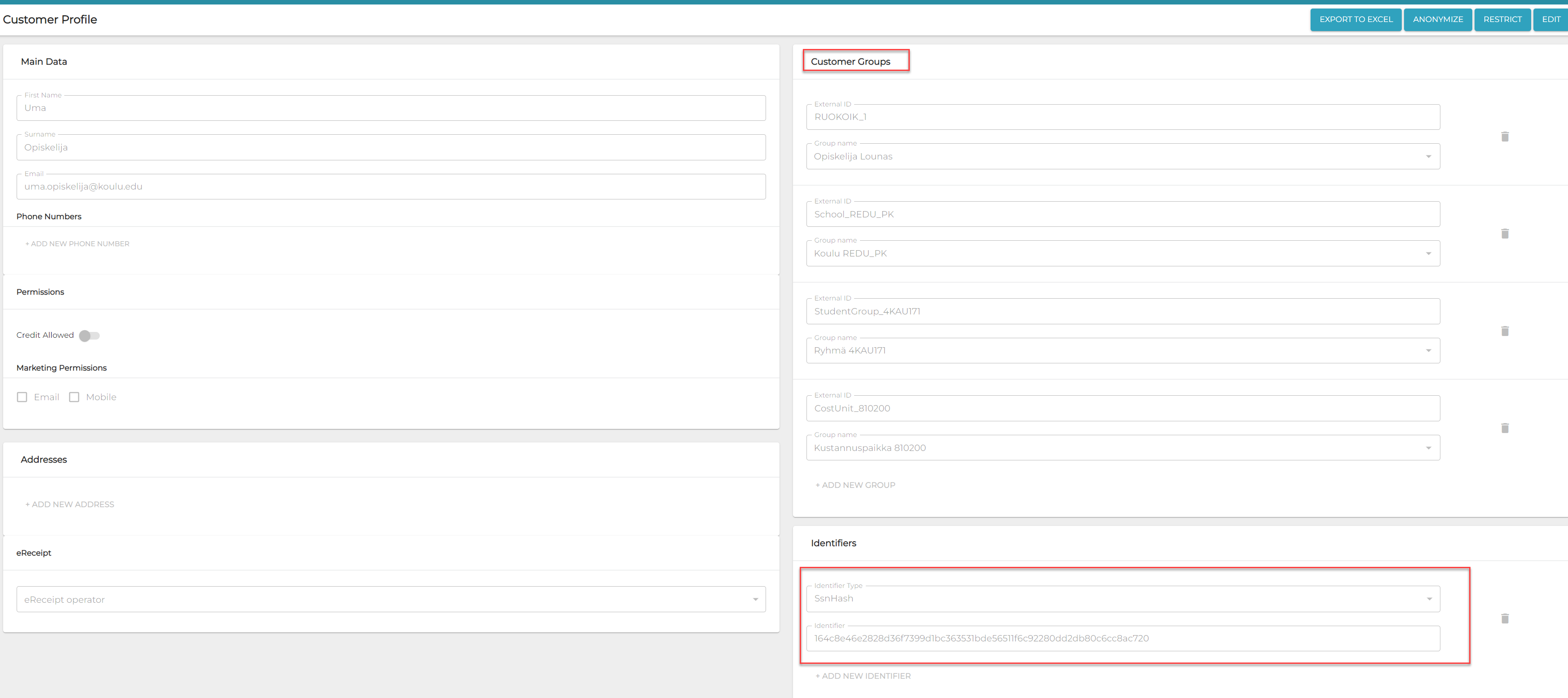 | Asiakastiedot voidaan hakea skannaamalla kortti, joka sisältää henkilötunnuksen | Asiakastiedot voidaan hakea skannaamalla CustomerCard-tunniste mobiilisovelluksesta. |