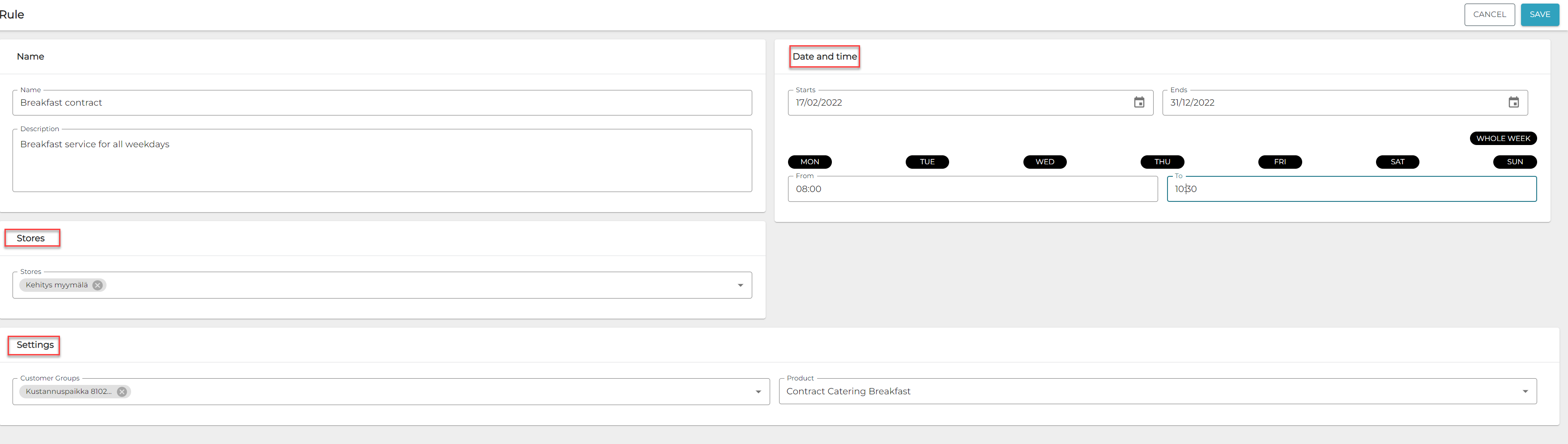 Myymälät: Valitse missä myymälöissä tätä sääntöä käytetään valitsemalla myymälät pudotusvalikosta.