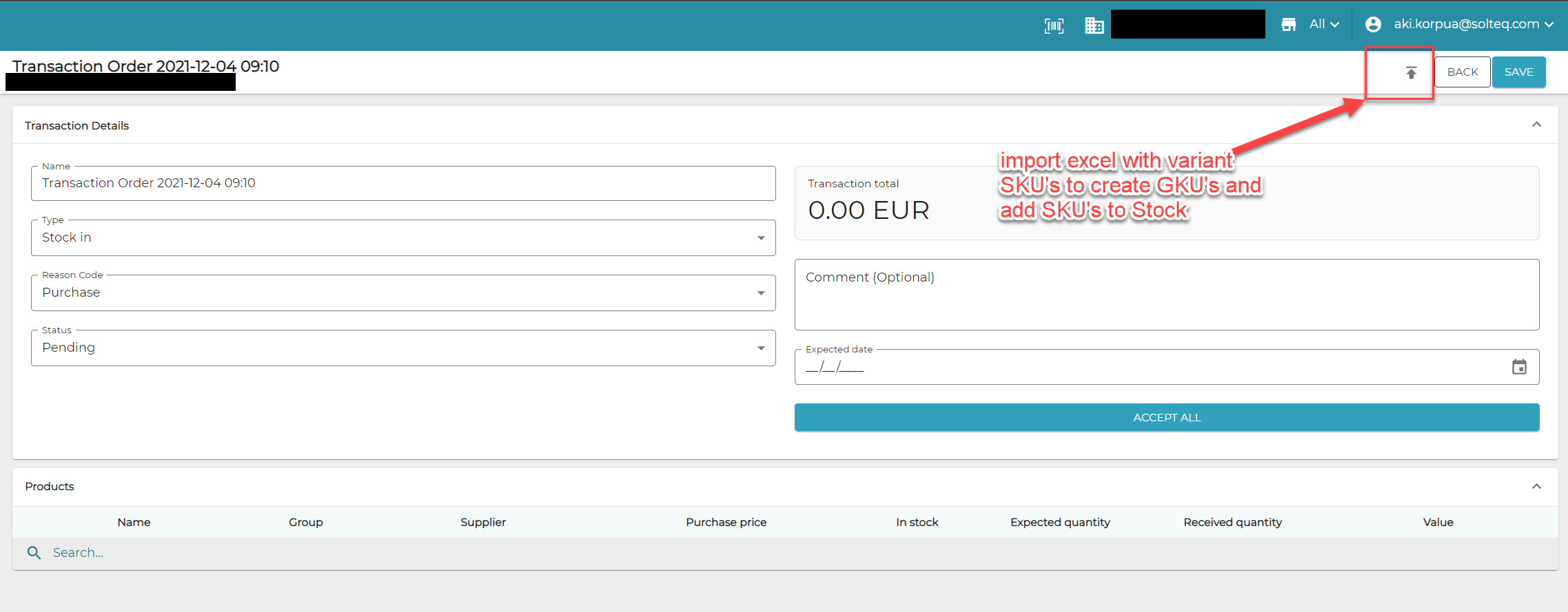 Lisää variantit varastoon tuomalla ne Excel-muodossa ostotilauksena.