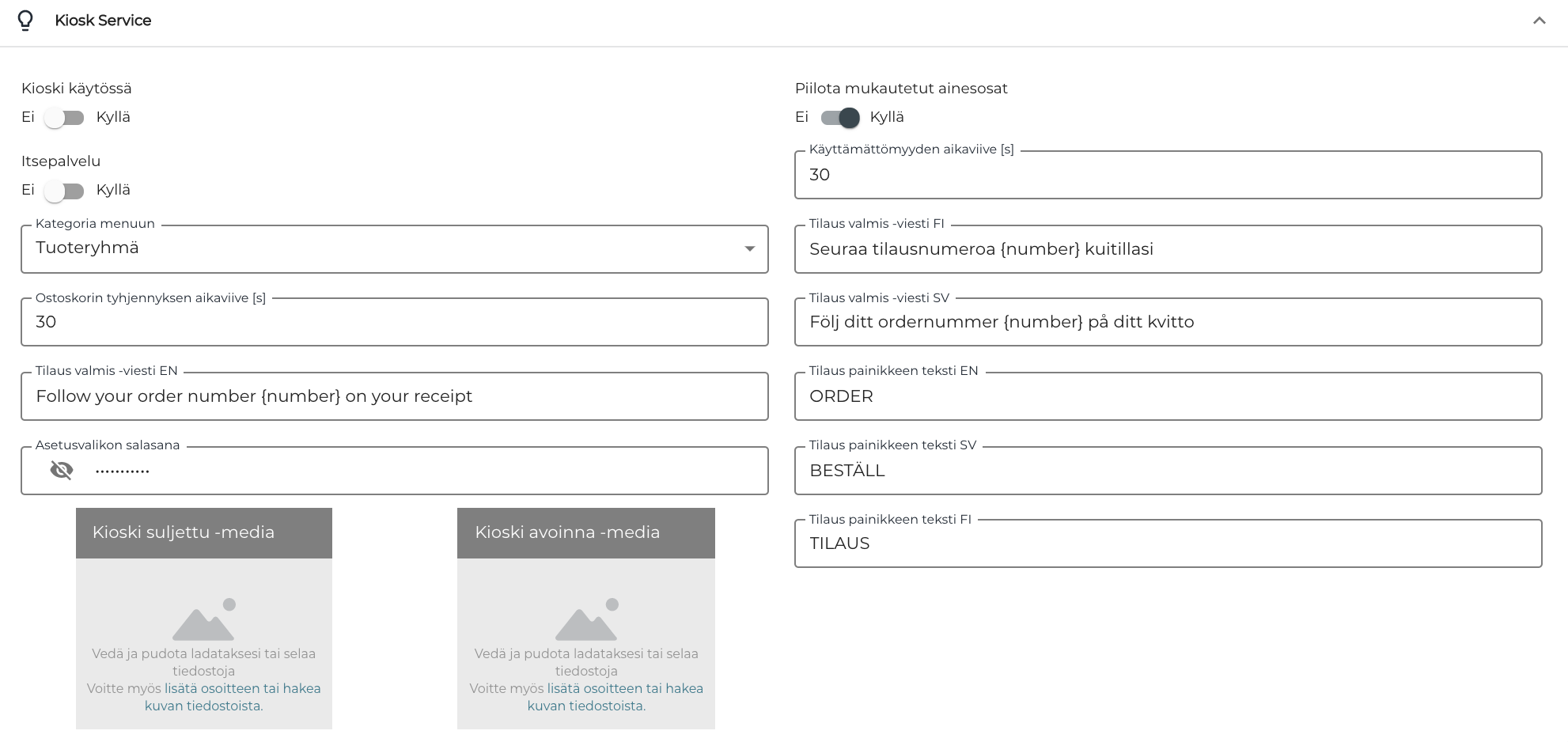 Kioski suljettu -media | Näytetään itsepalvelupäätteen näytöllä päätteen ollessa suljettuna. Pääte sulkeutuu automaattisesti, kun keittiö sulkeutuu; pääte on myös mahdollista avata ja sulkea käyttämällä kassan toimintopainiketta.