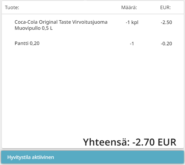 Hyvitystilan ollessa aktiivinen Hyvitystila aktiivinen -teksti näkyy ostoskorissa, ja Hyvitystila-painike muuttuu Myyntitila-painikkeeksi.