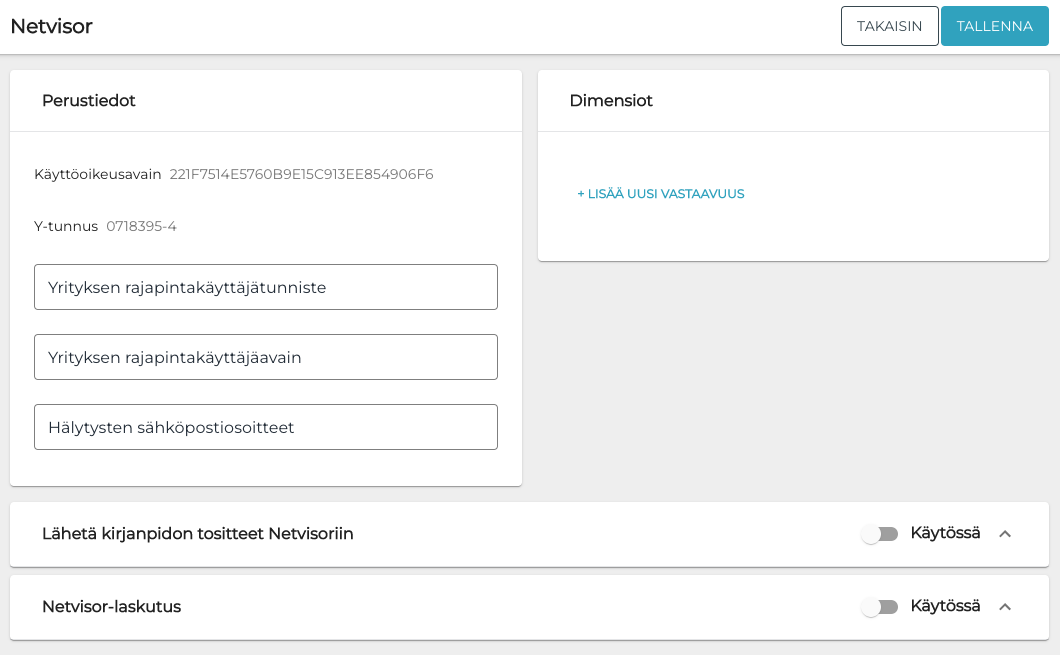 Liitä kohdassa 5 kopioidut arvot Yrityksen rajapintakäyttäjätunniste sekä Yrityksen rajapintakäyttäjäavain -kenttiin.