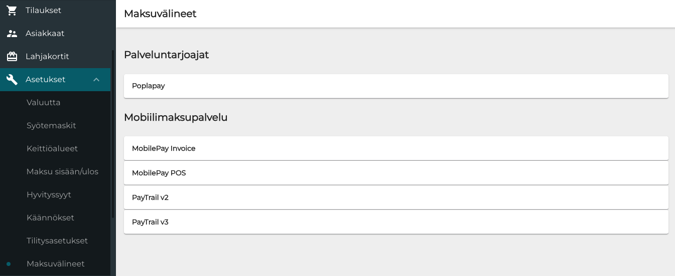 Taustapalvelun Maksuvälineet-näkymässä voit määritellä Solteq Commerce Cloudin kanssa käytettävät palveluntarjoajat ja mobiilimaksupalvelut. Pääset näkymään klikkaamalla Asetukset ja valitsemalla sitten Maksuvälineet taustapalvelun valikosta.