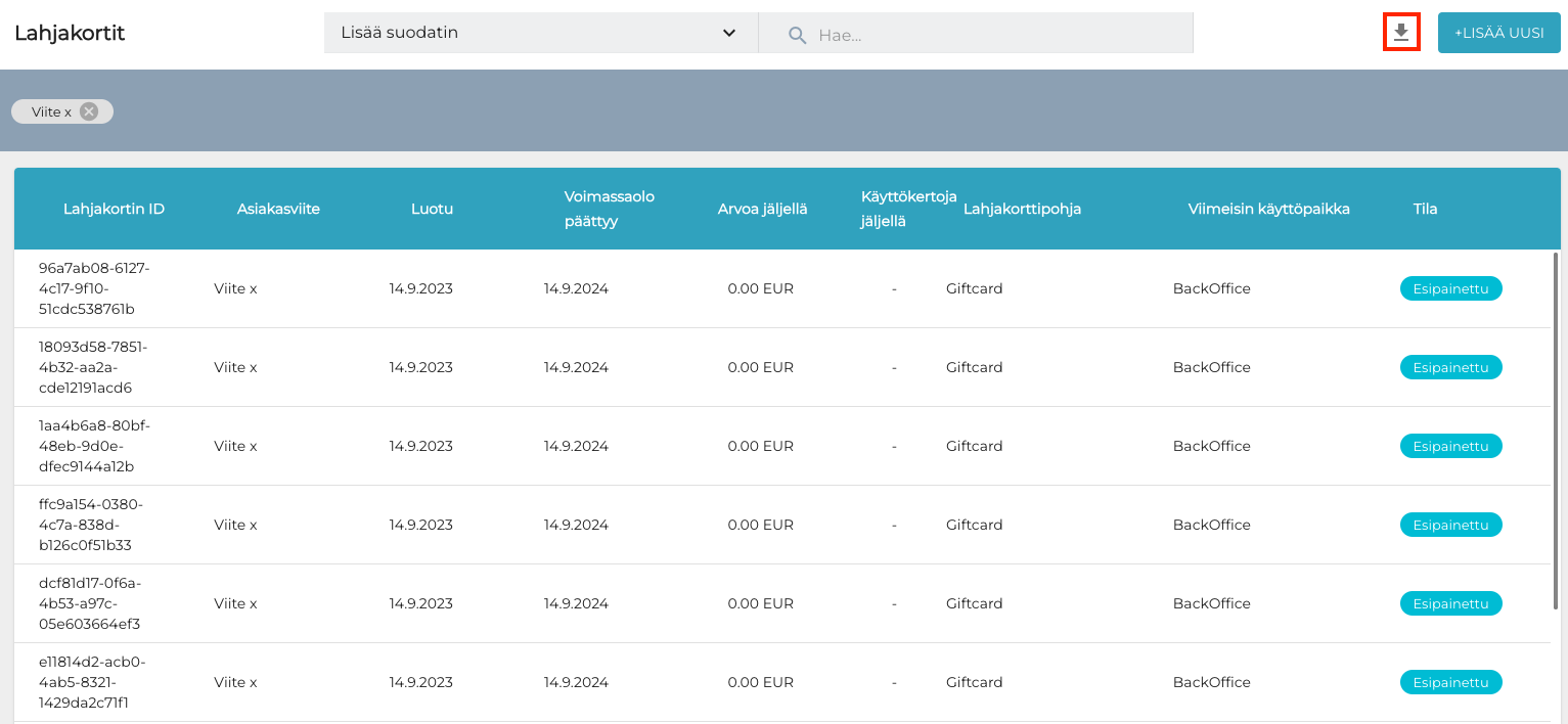 Valitse Lahjakortit-näkymässä suodattimeksi Asiakasviite, syötä lahjakorttierän nimi Asiakasviite-kenttään, ja klikkaa Suodata.