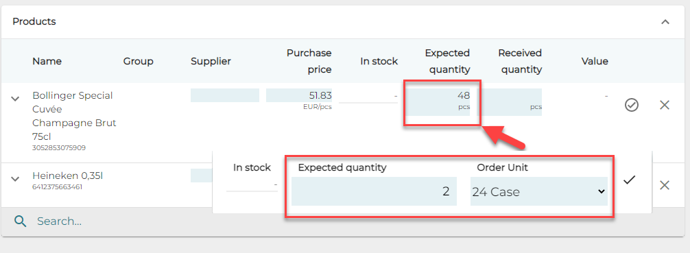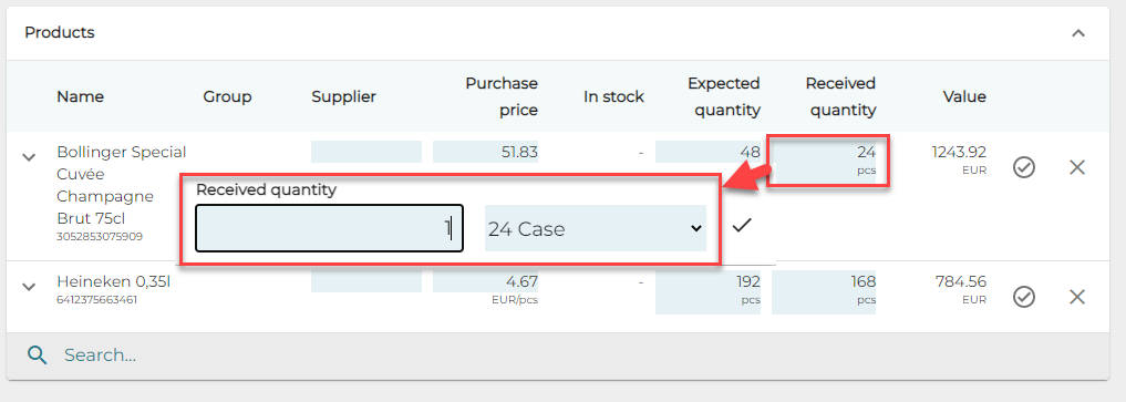 Saapuneen määrän muuttaminen, kun tuotteet on vastaanotettu