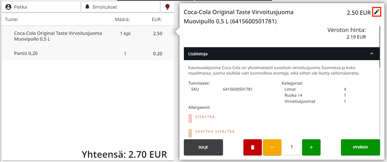 Jos asetus on päällä, kassalla tuotteen tiedoissa näkyy kynäkuvake oikeassa yläkulmassa. Klikkaa kuvaketta muuttaaksesi tuotteen hintaa.