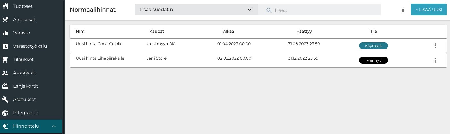 Voit tarkastella tämänhetkisiä hinnastoja sekä luoda uusia hinnastoja taustapalvelun Normaalihinnat-näkymässä. Uudet hinnastot voivat astua voimaan välittömästi, tai tulevana päivämääränä ja ajankohtana. Voit määritellä hinnastoja tietyille myymälöille, ja valita niihin yksittäisiä tuotteita, kokonaisia tuotekategorioita, tai tarvittaessa kaikki myyntituotteet.