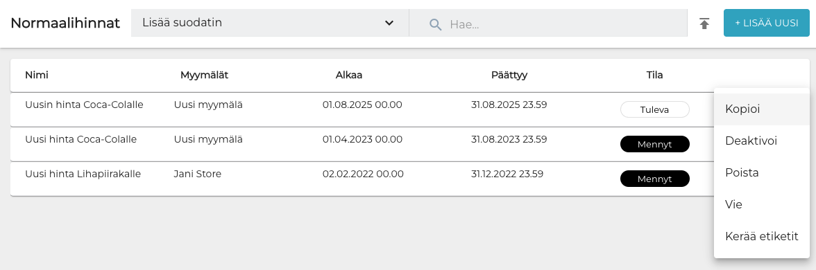 Klikkaamalla kolmea pistettä hinnaston rivillä voit valita jonkin seuraavista toiminnoista: Kopioi, Aktivoi/Deaktivoi, Poista tai Vie (joka tekee hinnastosta Excel-muotoisen tiedoston, ja lataa sen taustapalvelusta koneellesi).