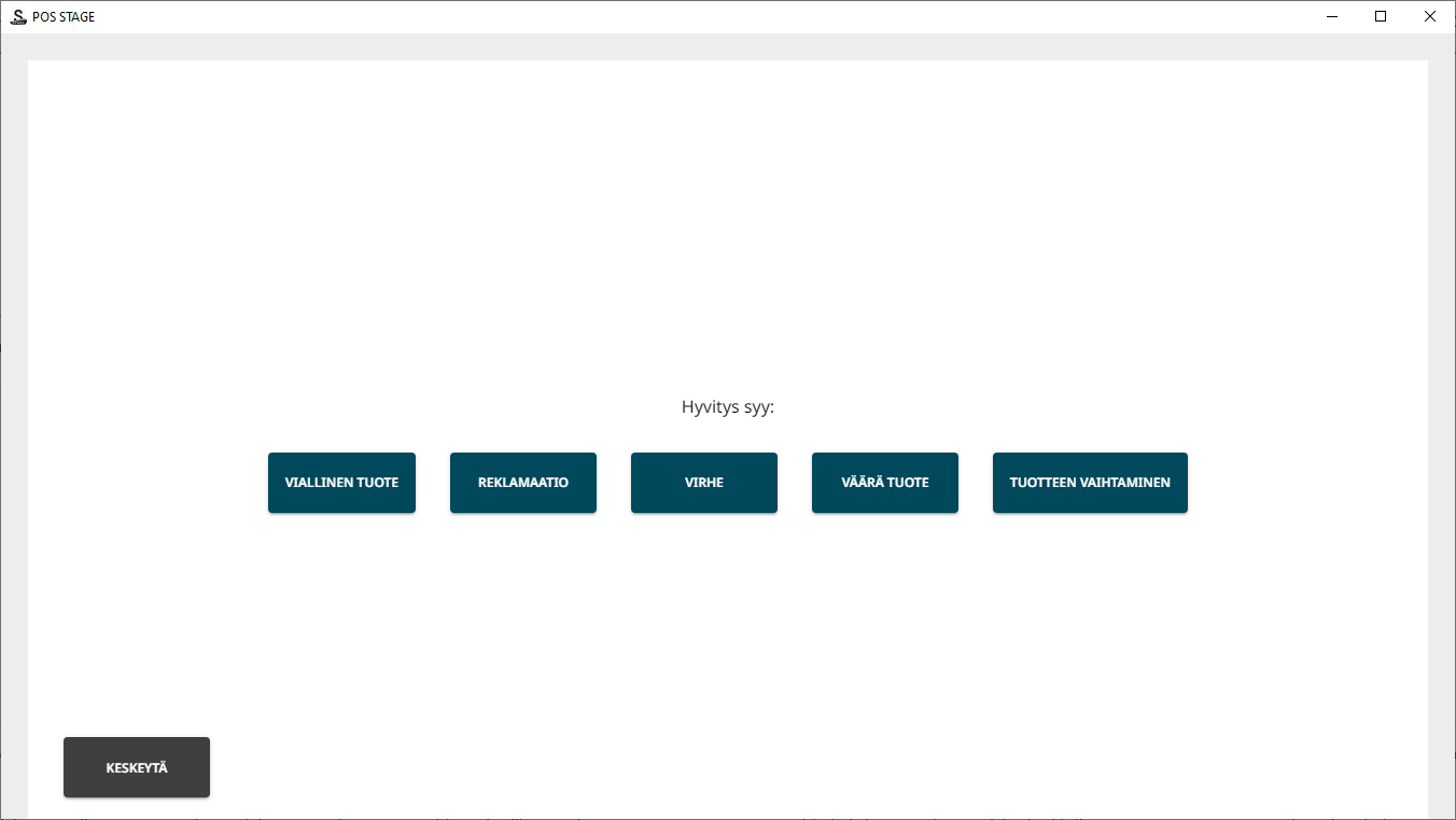 Kun olet ottanut hyvityssyyt käyttöön klikkaamalla Syykoodit käytössä -kytkimen päälle, syykoodi on aina annettava silloin kun kassalla suoritetaan kuitin hyvitys tai mitätöinti.