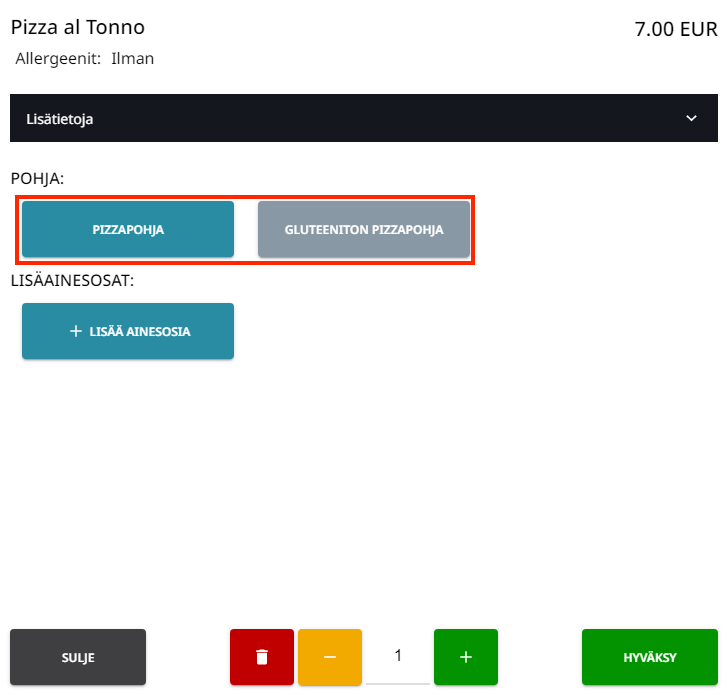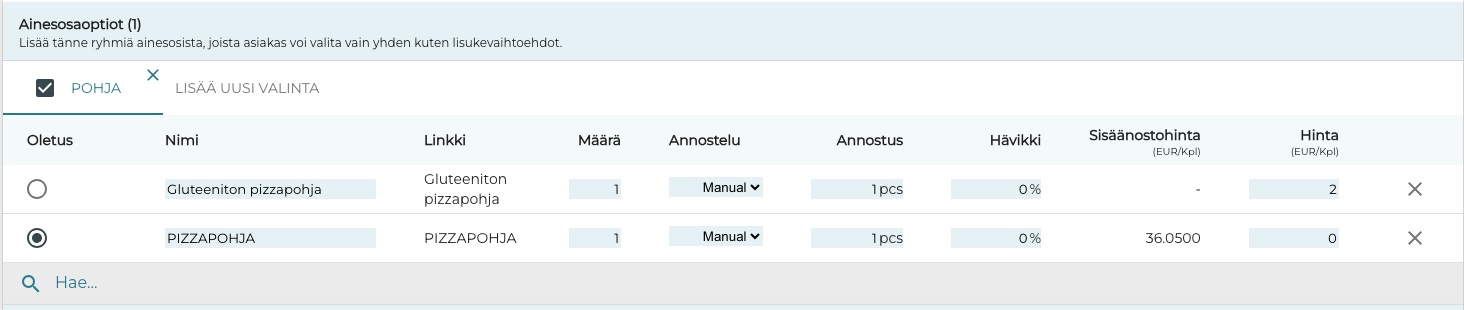 Reseptituotteen Ainesosaoptiot-ominaisuudella voit antaa vaihtoehtoja jonkin tuotteeseen kuuluvan ainesosan vaihtamiseksi: esimerkiksi tavallinen pizzapohja voi olla mahdollista vaihtaa gluteenittomaan.