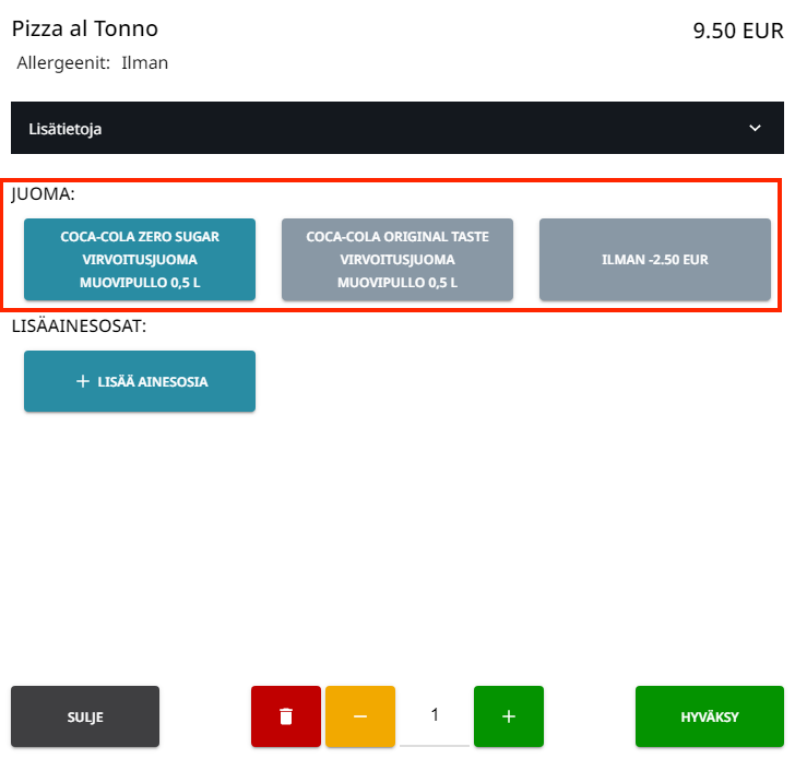 Reseptituotteen tuoteoptiot kassalla