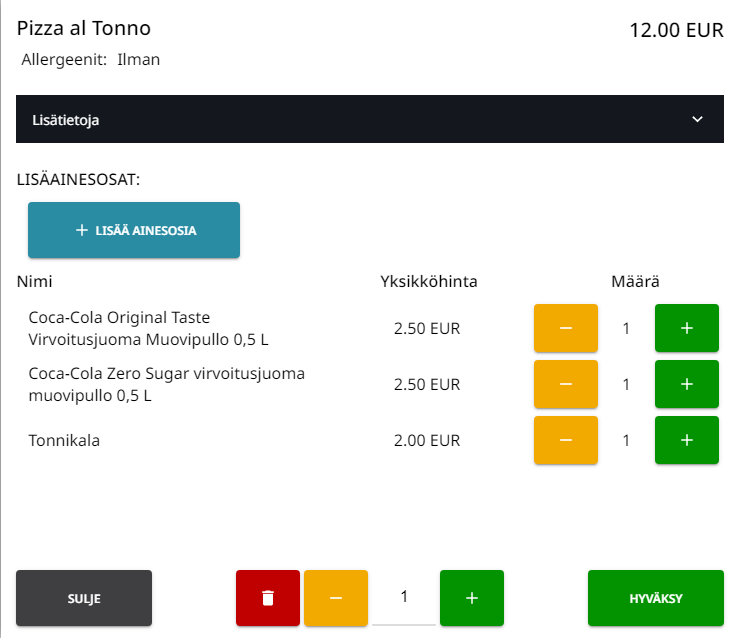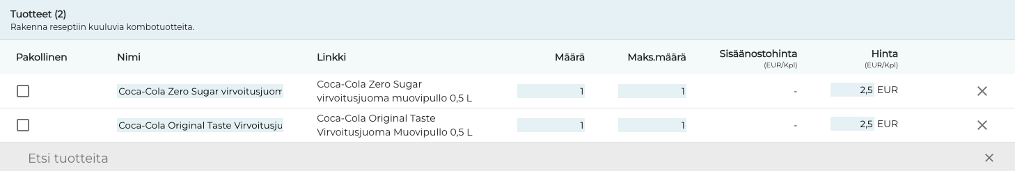 Alla olevassa esimerkissä Coca-Cola -juomia ei ole määritelty pakolliseksi, joten niiden määrän voi muuttaa kun ne lisätään ostoskoriin. Tuotteen määrä ei voi kuitenkaan olla suurempi kuin Maks. määrä.