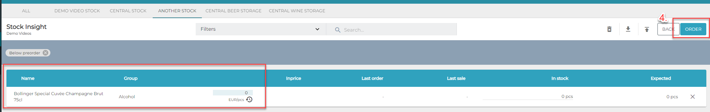 Valitse Lisää suodatin -valikosta Alle ennakon tai Alle minimin -suodatin, ja klikkaa sitten Suodata-painiketta. Käyttämällä suodattimia voit täydentää valitsemasi varaston mahdollisimman lähelle Maksimi-arvoja.