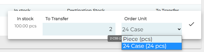 Voit tarvittaessa muuttaa tilausyksikön ja/tai siirrettävän määrän klikkaamalla Siirrettävä-kenttää ja syöttämällä/valitsemalla ponnahdusikkunassa niille uudet arvot.
