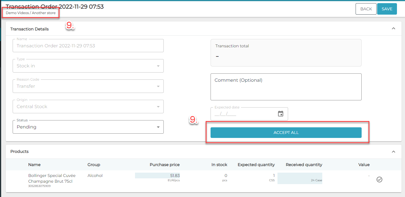 Kohdevarastossa Varasto sisään -siirtotapahtuma voidaan nyt tarkastaa ja hyväksyä.