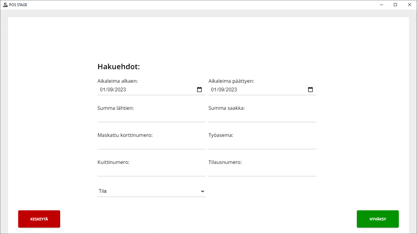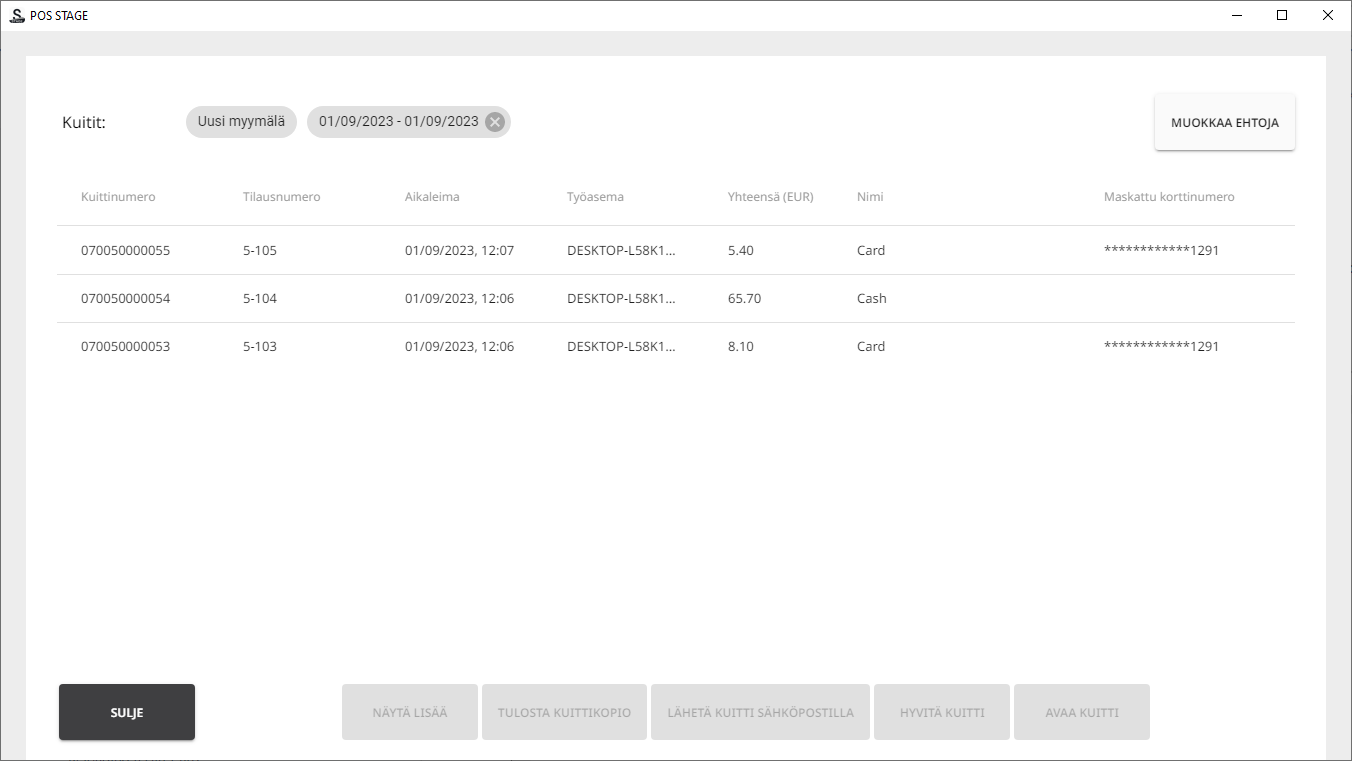 Voit rajata kuittihakua voidaan tietylle aikavälille, summalle ja työasemalle. Voit myös hakea kuitteja suoraan kuittinumerolla tai kuitin tilan perusteella.
