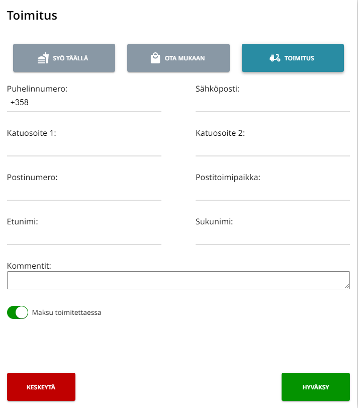Mikäli valitsit toimitustavaksi Toimituksen, syötä tiedot toimitukselle.