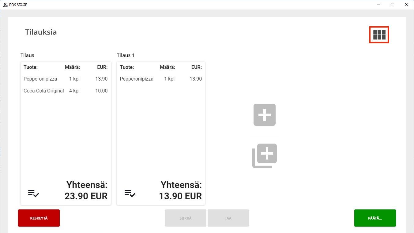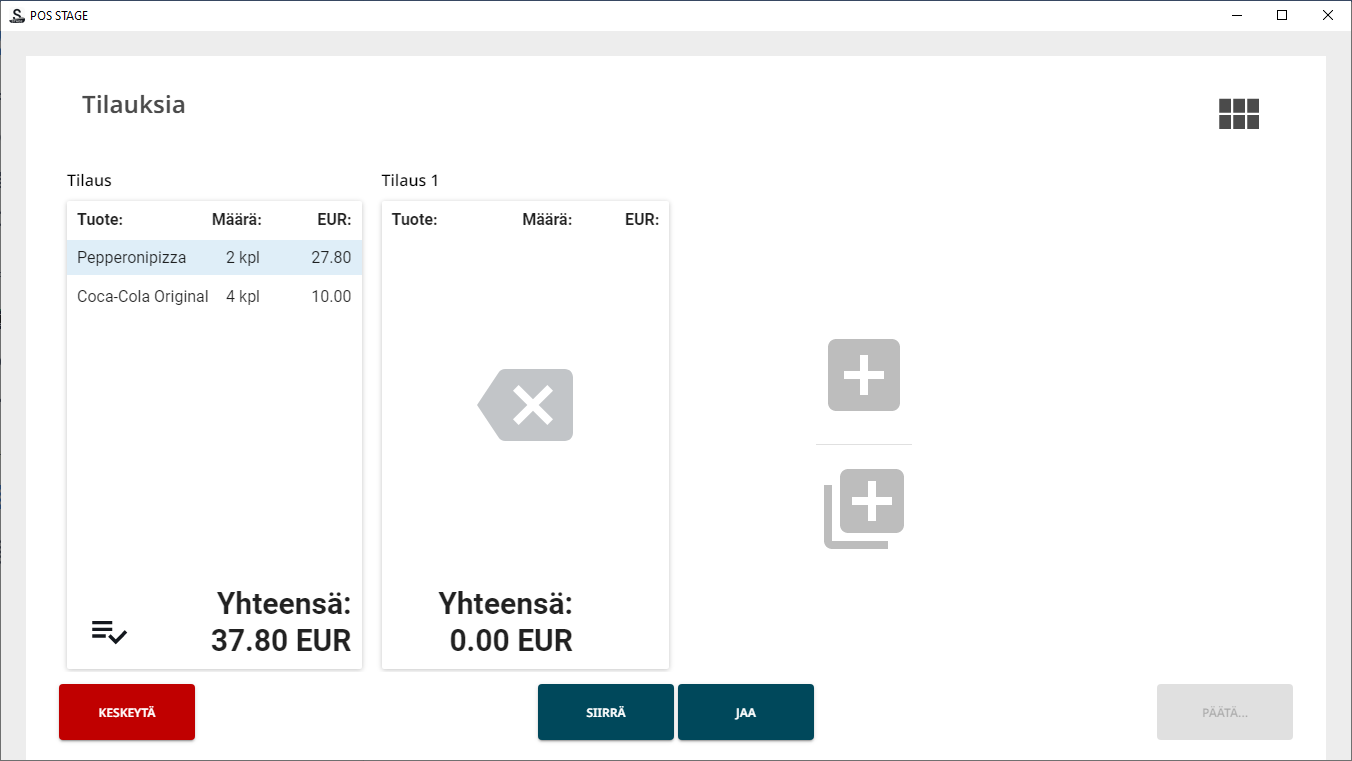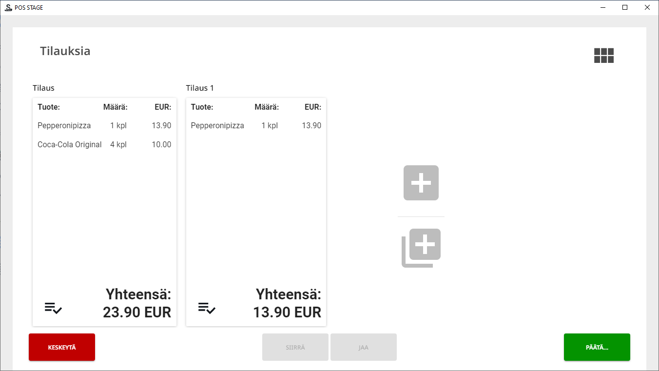 Tämä on hyödyllinen toiminto, kun ravintolassa käytetään maksun jakamista useampiin maksutapoihin, ja maksut lasketaan ennen päivän päättämistä.