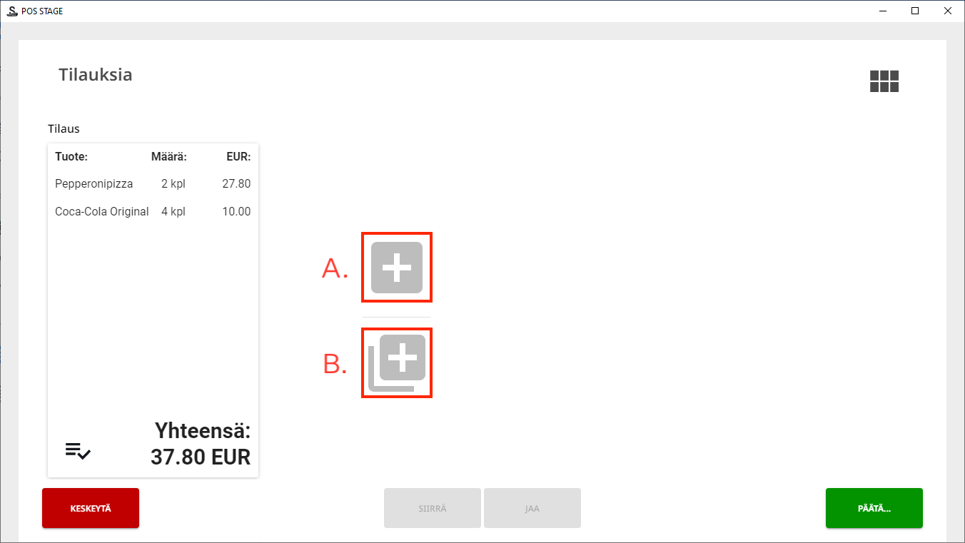 Lisää tilaus- (A.) ja Lisää tilauksia (B.) -kuvakkeet