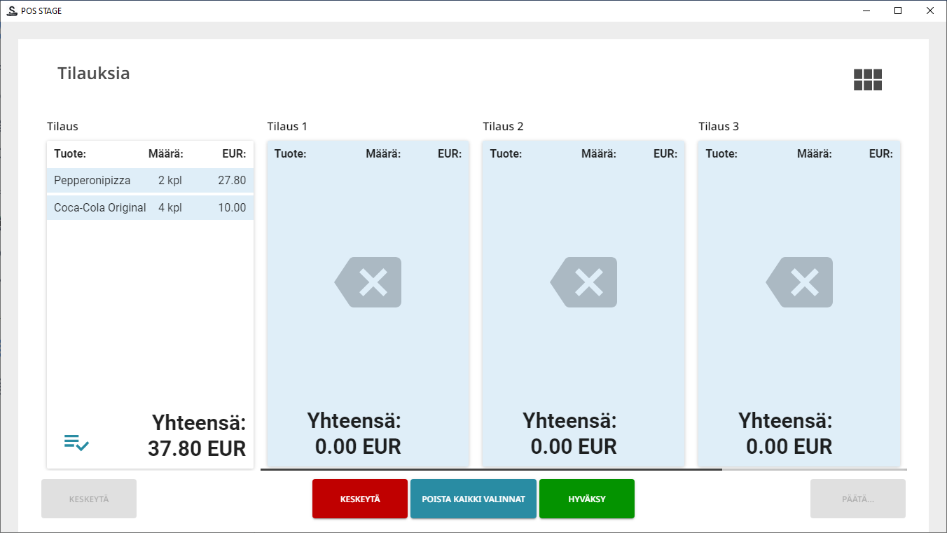 Kuitti jaetaan, ja kaikki luodut uudet kuitit menevät kuittiparkkiin. Kahden sekunnin viiveen jälkeen tulee näkyviin Tilaukset-näkymä, jossa kuitit ovat näkyvissä.