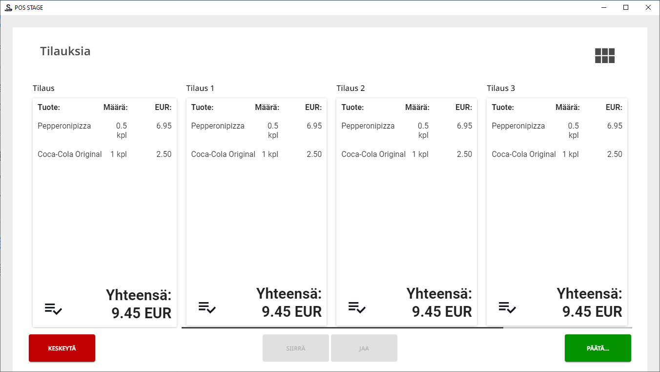 Tilauksia-näkymä on nyt päivitetty. Paina lopuksi Päätä…, jolloin pääset viimeistelemään kuitin jakamisen.