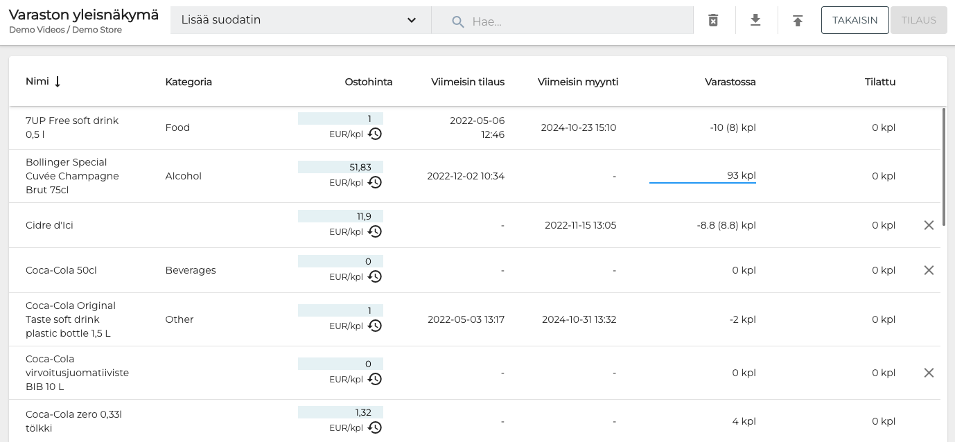 Voit tarkastella varaston nykyisiä tuotesaldoja sekä päivittää varastonimikkeiden ostohintoja Varaston yleisnäkymässä. Voit myös viedä ja tuoda varastonimikkeiden tietoja Excel-muodossa, esimerkiksi kun haluat tehdä kerralla muokkauksia useiden varastonimikkeiden tietoihin.