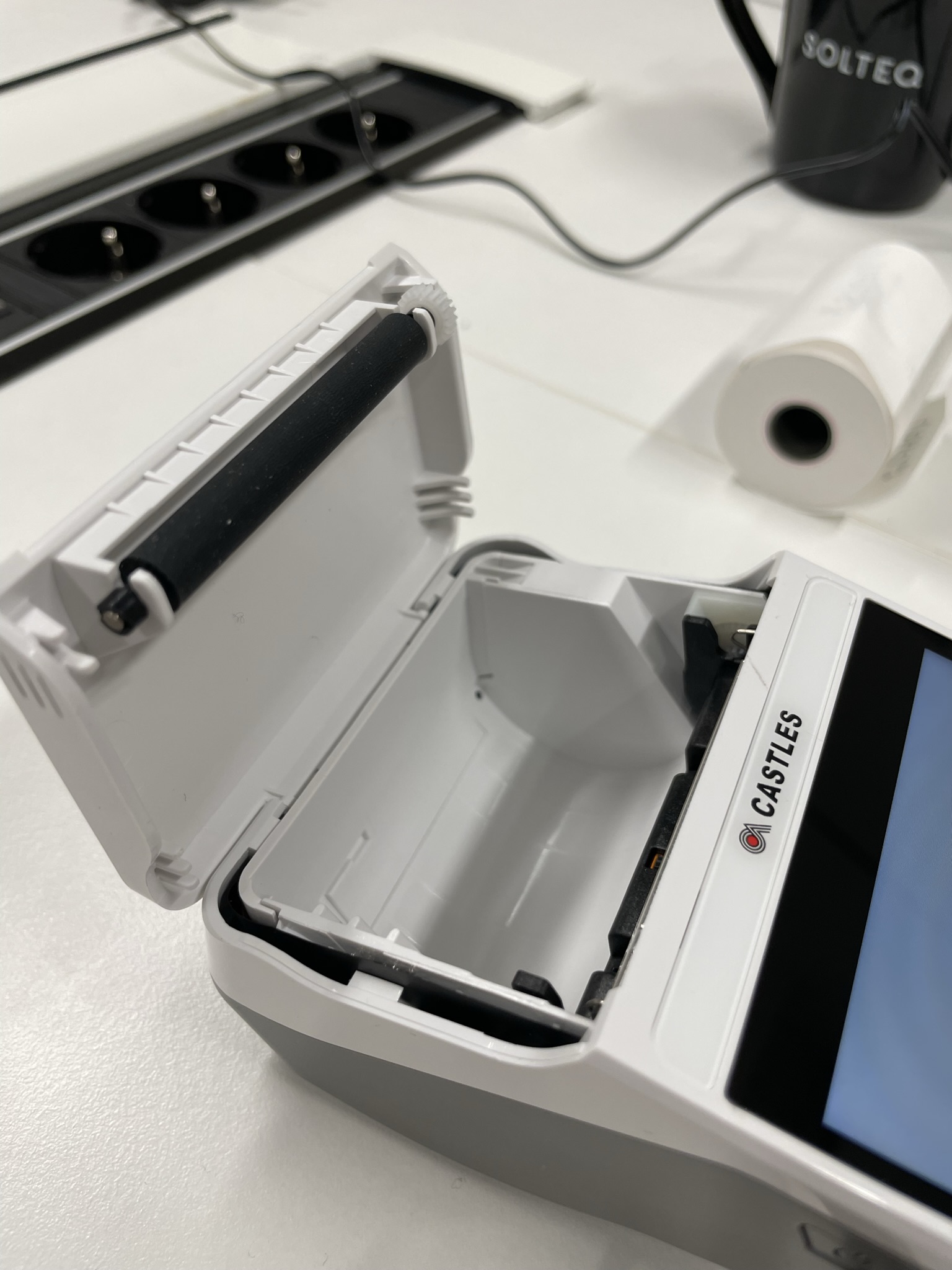 Laitteen ohjelmistopäivityksen aikana voit asettaa kuittirullan. Avaa ensiksi rulla.