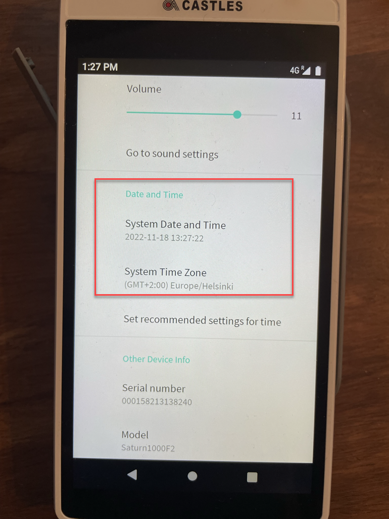 Tarkista myös, että laitteen päivämäärä, aika ja aikavyöhykeasetukset ovat oikein ennen kuin aloitat myynnin. Löydät asetukset painamalla pyöreää kuvaketta ruudun alaosassa.