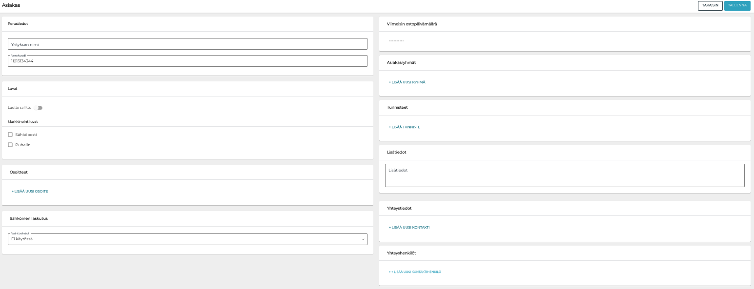 6. Tallenna lopuksi tiedot ja poistu näkymästä klikkaamalla Tallenna. Uusi yritysasiakas on nyt lisätty taustapalveluun.