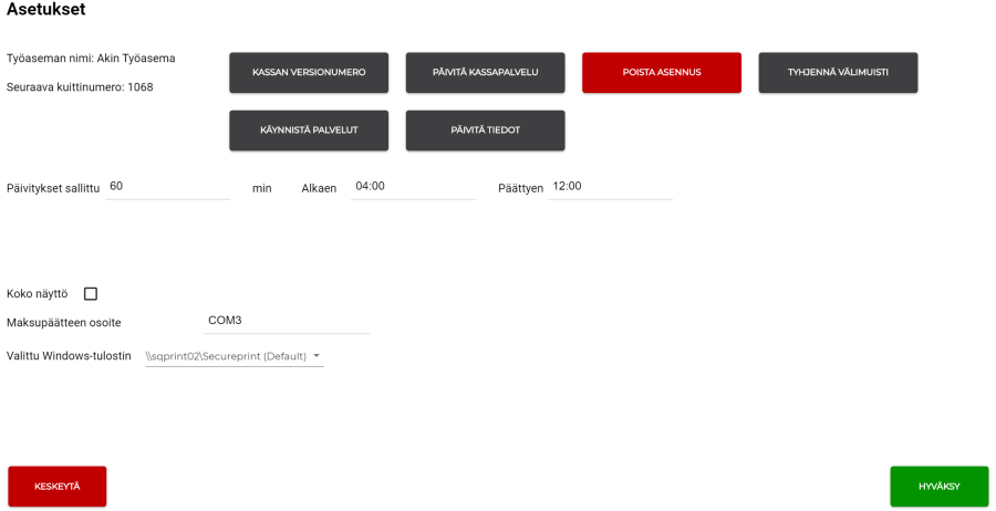 Lisätty kassan asetuksiin Verifonen maksupäätteen portin voi vaihtaminen sekä Windows tulostinjono, jos käytössä on windows tulostin. HUOM! Asetukset ovat näkyvillä vain kun käyttäjä on kirjautunut kassaan sisään ja asetuksiin mennään valikon kautta, ei suoraan asetus mutterista kirjautumisruudulla.