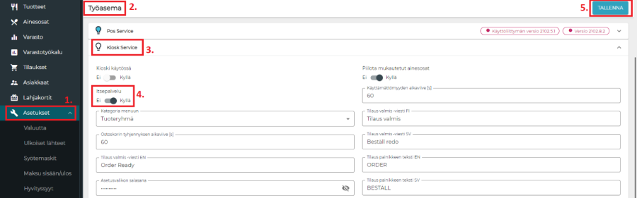 kolme kertaa. Tämän jälkeen syötetään kioskille määritelty Asetusvalikon salasana. Sen syöttämisen jälkeen näppäimet raporteille ja uloskirjautumiseen ilmestyvät vasempaan yläkulmaan.
