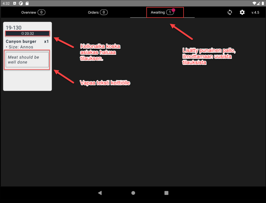 Ennakkotilaus verkkokaupan kautta tulee ensin keittiöön hyväksyttäväksi uuteen välilähteen "Odottaa" (eng. Awaiting)