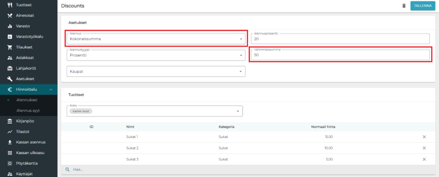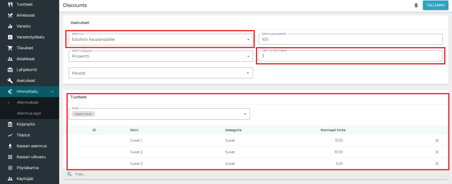 Lopuksi syötetään tuotteet, joita alennus koskee. Tuotteita on mahdollista valita yksittäin tai kategorioittain. Esimerkissä on valittu kolme yksittäistä tuotetta, jotka kuitenkin kuuluvat samaan kategoriaan. Esimerkin pakettikooksi on määritelty kaksi, joten alennus annetaan, kun kaksi kolmesta alennukseen kuuluvasta tuotteesta on lisätty kuitille. Kuten muissakin kampanjatyypeissä, tässäkin voidaan valita tuotteista tietyt koot, jotka oikeuttavat alennukseen.