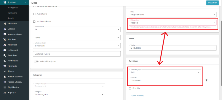 Mikäli Tuotteet-valikon kautta luotavan tuotteen mittayksikkönä on eri kuin varastoon luodun varastotuotteen, ohjelma antaa tästä virheilmoituksen.
