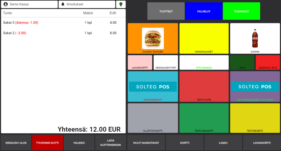 Kassalla ohjelma antaa alennuksen, kun vaaditut tuotteet on lisätty kuitille.