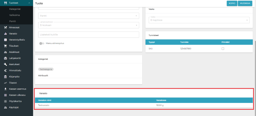 Mikäli tuotteen varastonarvoon tehdään muutoksia, ne päivittyvät automaattisesti myyntituotteelle. Myyntituotteesta voidaan tehdä normaalisti painike kassanulkoasuun. Myyntituotteen muokkauksilla, esimerkiksi varastotunnuksen poistamisella myyntituotteesta, ei ole vaikutusta varastotuotteeseen.