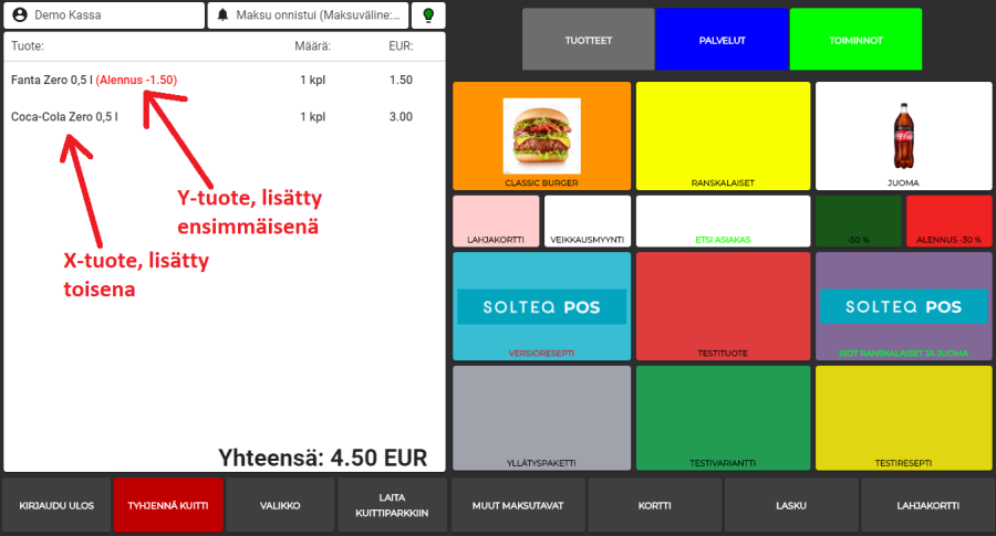 Kassalla tuotteita myytäessä alennus astuu automaattisesti voimaan, kun ostoskoriin on lisätty sekä X- että Y-tuotteet. Tuotteiden lisäysjärjestyksellä ei ole väliä.