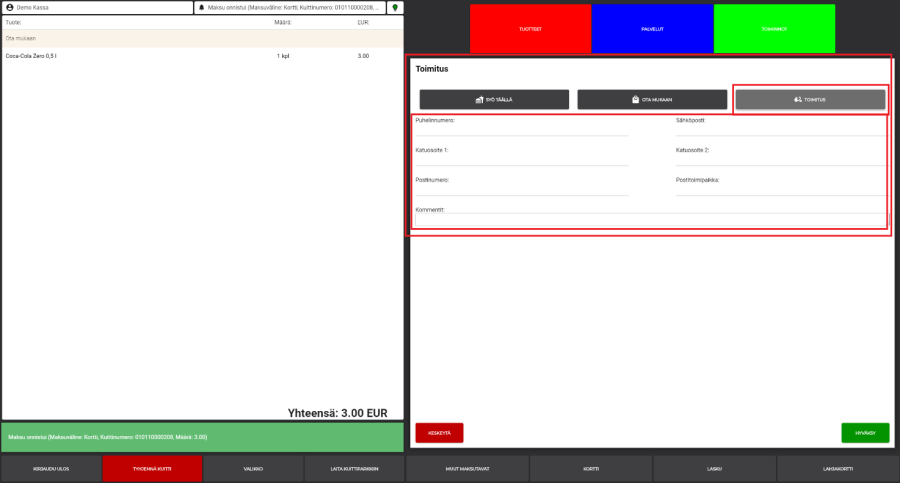 Kassalla on mahdollista valita tilauksen toimitustavaksi "Syö täällä", "Ota mukaan" tai "Toimitus", johon on mahdollista syöttää toimitustiedot.