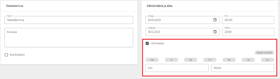 Kampanjoita on mahdollista ajastaa toistumaan päivän tai kellonajan mukaan. Tämä mahdollistaa esimerkiksi lounaskampanjoiden luomisen. Kampanjan asetuksista on asetettava päälle "Voimassa"-valinta, minkä jälkeen voidaan asettaa halutut voimassaoloajat.