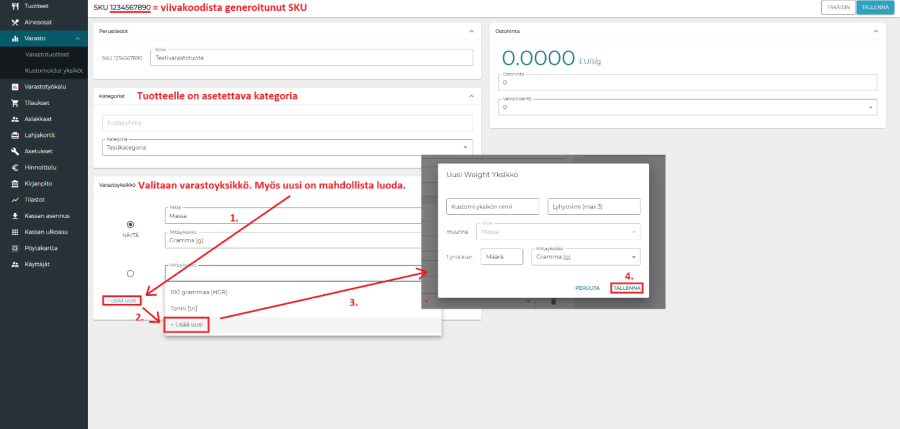 Kun uniikki viivakoodi on annettu, ohjelma generoi uuden tuotteen, jonka varastotunnukseksi tulee juuri syötetty viivakoodi. Uudelle tuotteelle syötetään nimi, kategoria, varastoyksikkö, verollinen ostohinta ja veroprosentti. Mikäli tuotetta luotaessa halutaan syöttää esimerkiksi tuotteen koko, voidaan lisätä uusi, sopiva varastoyksikkö. Kun tuotteelle on syötetty kaikki tiedot, painetaan tallenna.