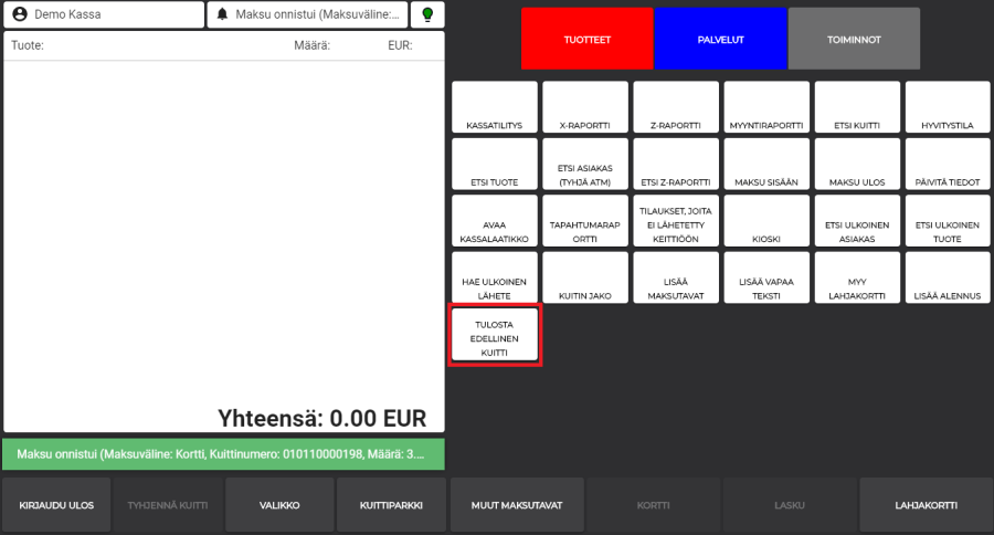 Uudessa versiossa kassalla on mahdollista jättää kuitti kokonaan tulostamatta tai tulostaa se jälkikäteen erillisestä painikkeesta. Tulostettaessa kuitti erillisestä painikkeesta kassaohjelmasta tulostuu edellinen hyväksytty kuitti.