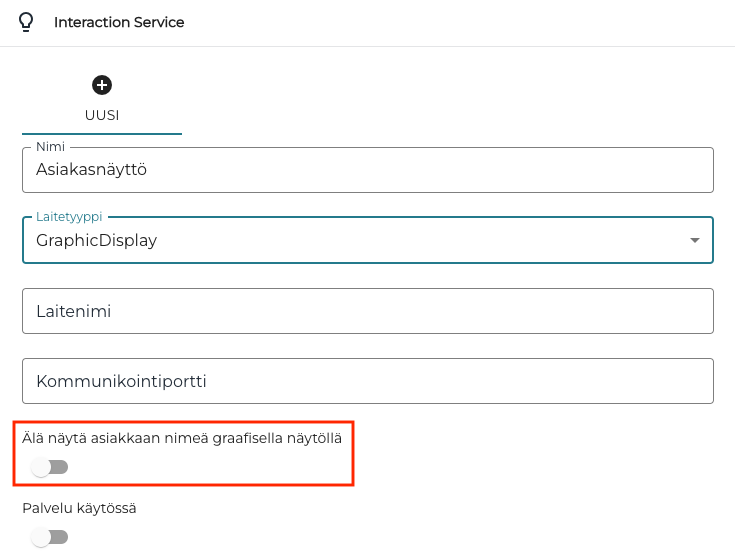 Asiakasnäyttö näyttää oletusarvoisesti asiakkaan nimen, kun asiakas on valittu ostoskoriin. Nyt voi piilottaa asiakkaan nimen näkyvistä asiakasnäytöltä laittamalla Älä näytä asiakkaan nimeä graafisella näytöllä -kytkimen päälle työaseman Interaction Service -asetuksissa.