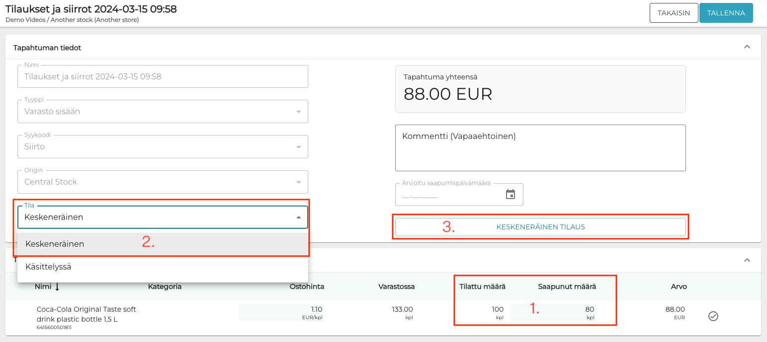 Kun varastosiirrossa tuotteen Saapunut määrä (1.) on pienempi kuin Tilattu määrä, voit tallentaa siirron Keskeneräisenä (2.).