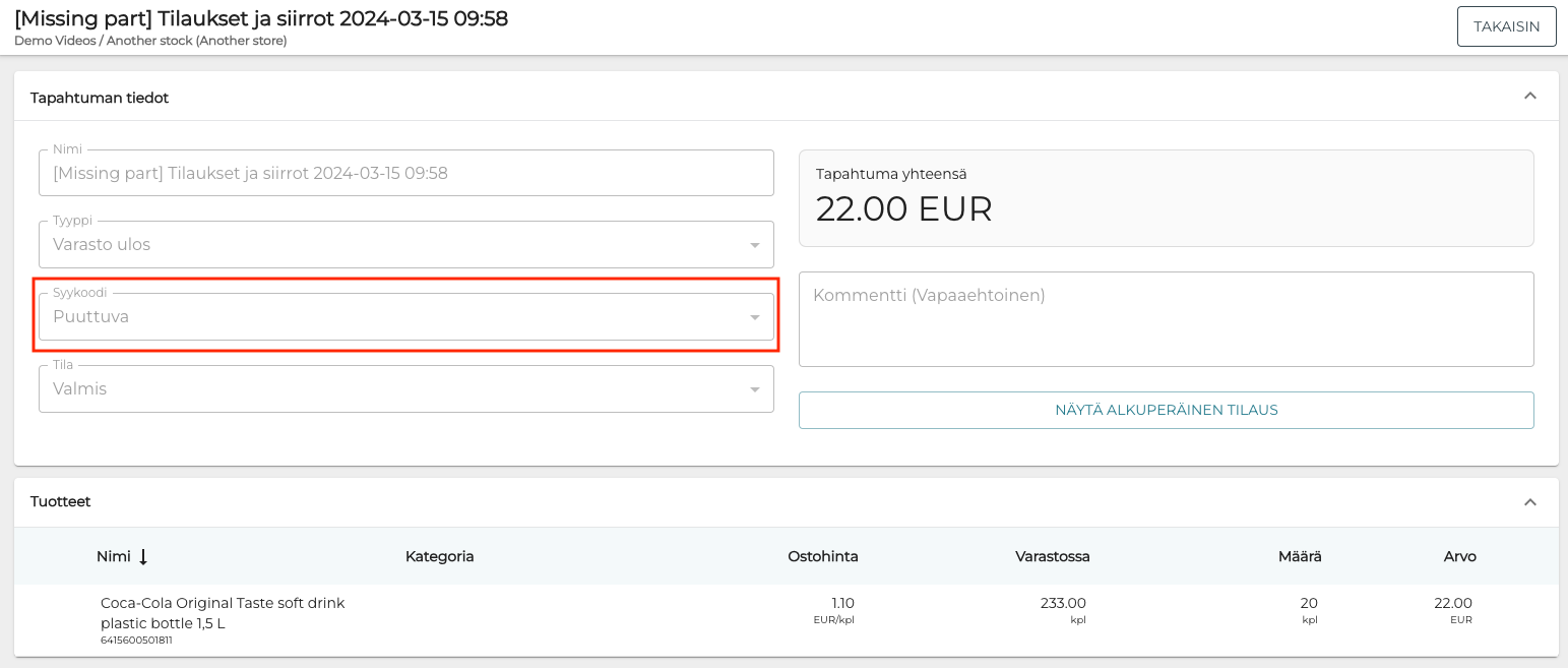 Puuttuva-syykoodilla luodun varastosiirron tiedot