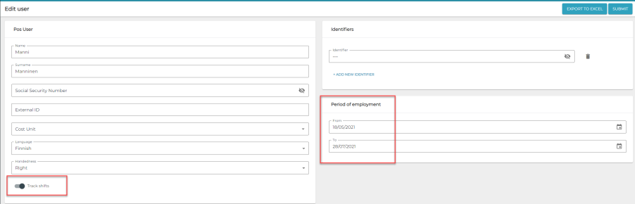 Kassakäyttäjien takana voidaan määritellä esim. kesätyöntekijöille sopimuksen voimassaoloaika sekä kaikilla käyttäjätyypeillä on mahdollisuus jättää henkilö ulos työajanseurannasta.