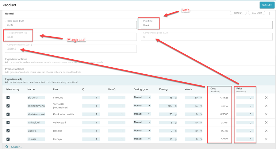 Tuotteiden hinnoittelua on selkeytetty. Nyt taustalla tuotteen hinnoittelun yhteydessä näkee ostohinnan suhteutettuna myyntimääriin. Muutos on tehty ainesosiin, varastotuotteisiin ja resepteihin.