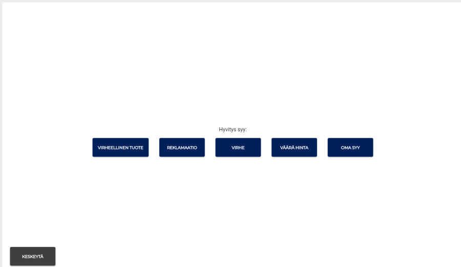 Hyvityssyyt voidaan ottaa käyttöön Asetukset -> Hyvityssyyt. Järjestelmä tarjoaa muutaman esimerkkisyykoodin, mutta niitä voi lisätä omien tarpeiden mukaan. Lisäksi käyttöön voidaan ottaa hyvityksen yhteydessä annettava vapaa teksti, johon voi syöttää selityksen. Kassalla hyvityksen syy on annettava niin vapaassa hyvityksessä kuin kuittiin kohdistuvassa hyvityksessä. Vapaassa hyvityksessä syykoodi on annettava vasta siirryttäessä rahan palautukseen.