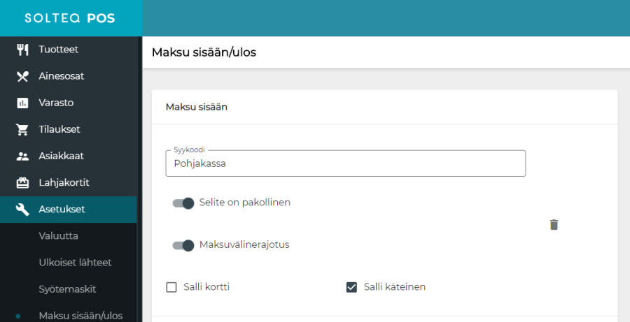Kassajärjestelmään on lisätty maksuvälinerajoitukset tuotteille ja Maksu sisään / ulos -syykoodeille. Tuotteelle se voidaan aktivoida asettamalla "Maksuvälinerajotus"-asetus päälle. Tämän jälkeen oletuksena kaikki maksuvälinetyypit on rajattu pois käytöstä ja on erikseen päätettävä, mitkä maksuvälinetyypit sallitaan.