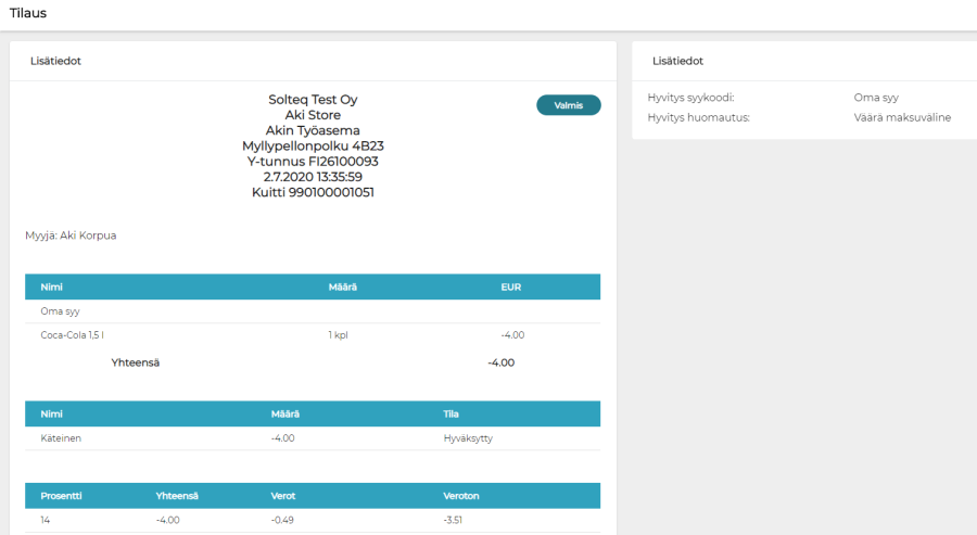 Asiakkaan kuitille hyvityksen syytä ei kirjoiteta, mutta se näkyy yllä olevalla tavalla taustapalvelussa.