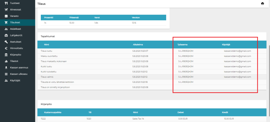 Lisätty työasema ja käyttäjä taustalla tilauksen tapahtumiin